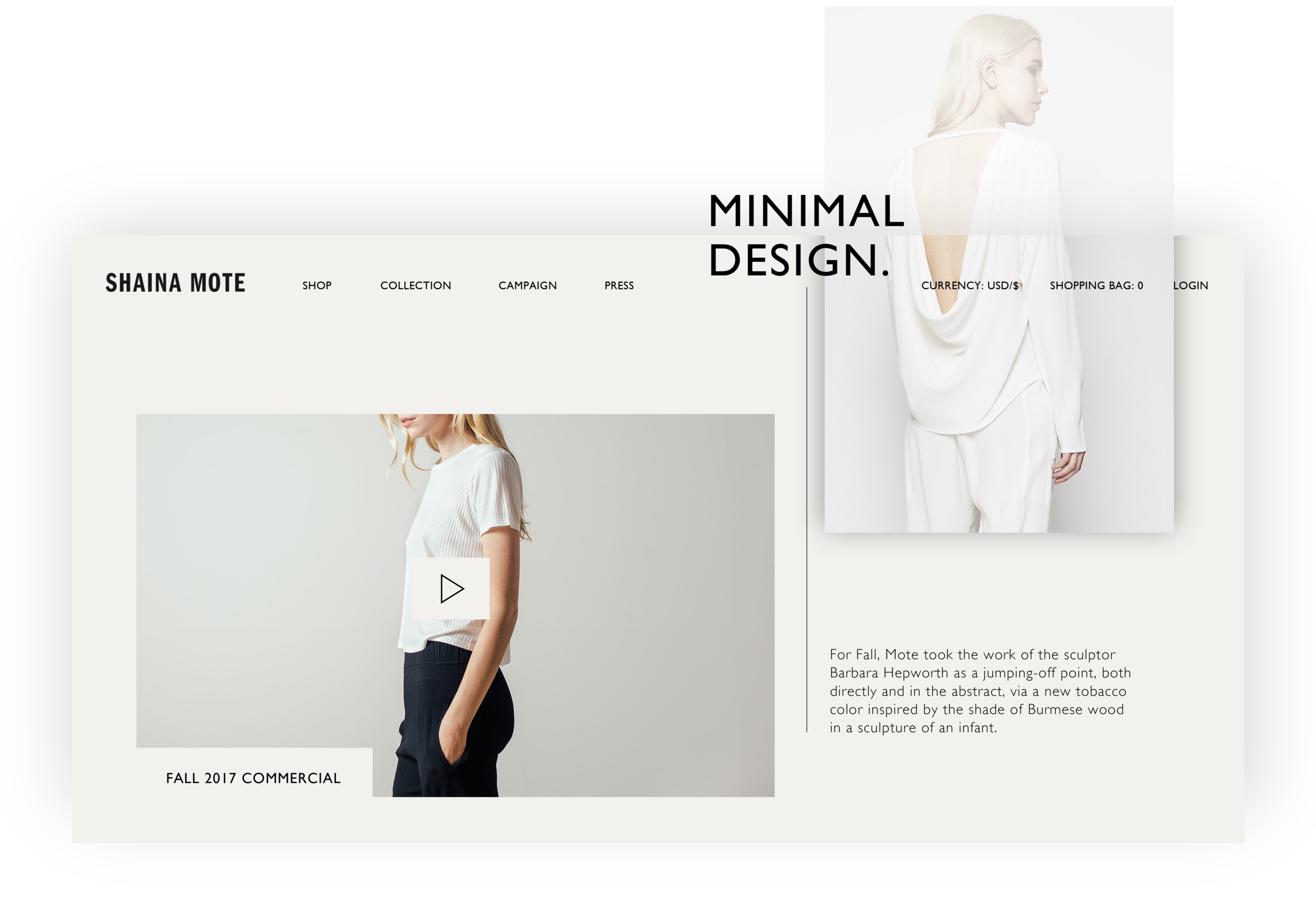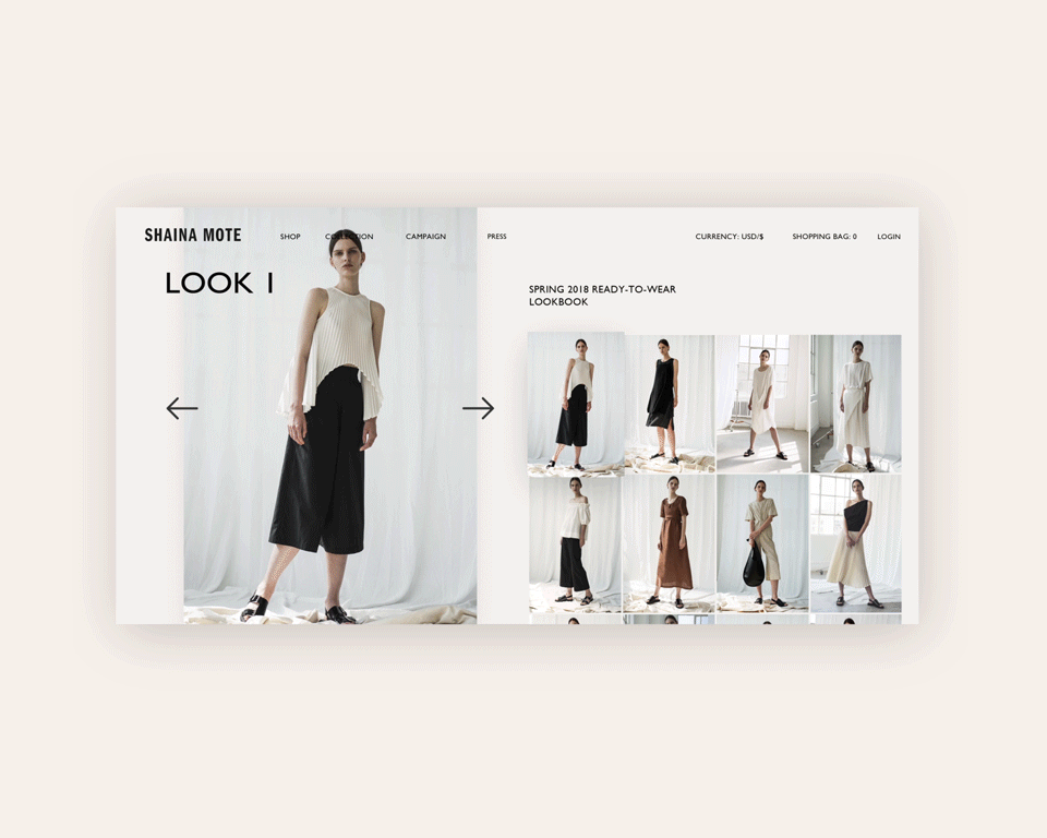 SHAINA MOTE is an emerging fashion brand based in Los Angeles which has a reputation of minimalistic design. Following the style of the brand, the project comes with a website template design which embraces simplicity and clarity with bold typography and imagery. This concept template is built on a geometric grid system, which demonstrates the modern-feel of design in both user experience and fashion. In addition, it provides a simple-to-use digital user experience for its website navigation.