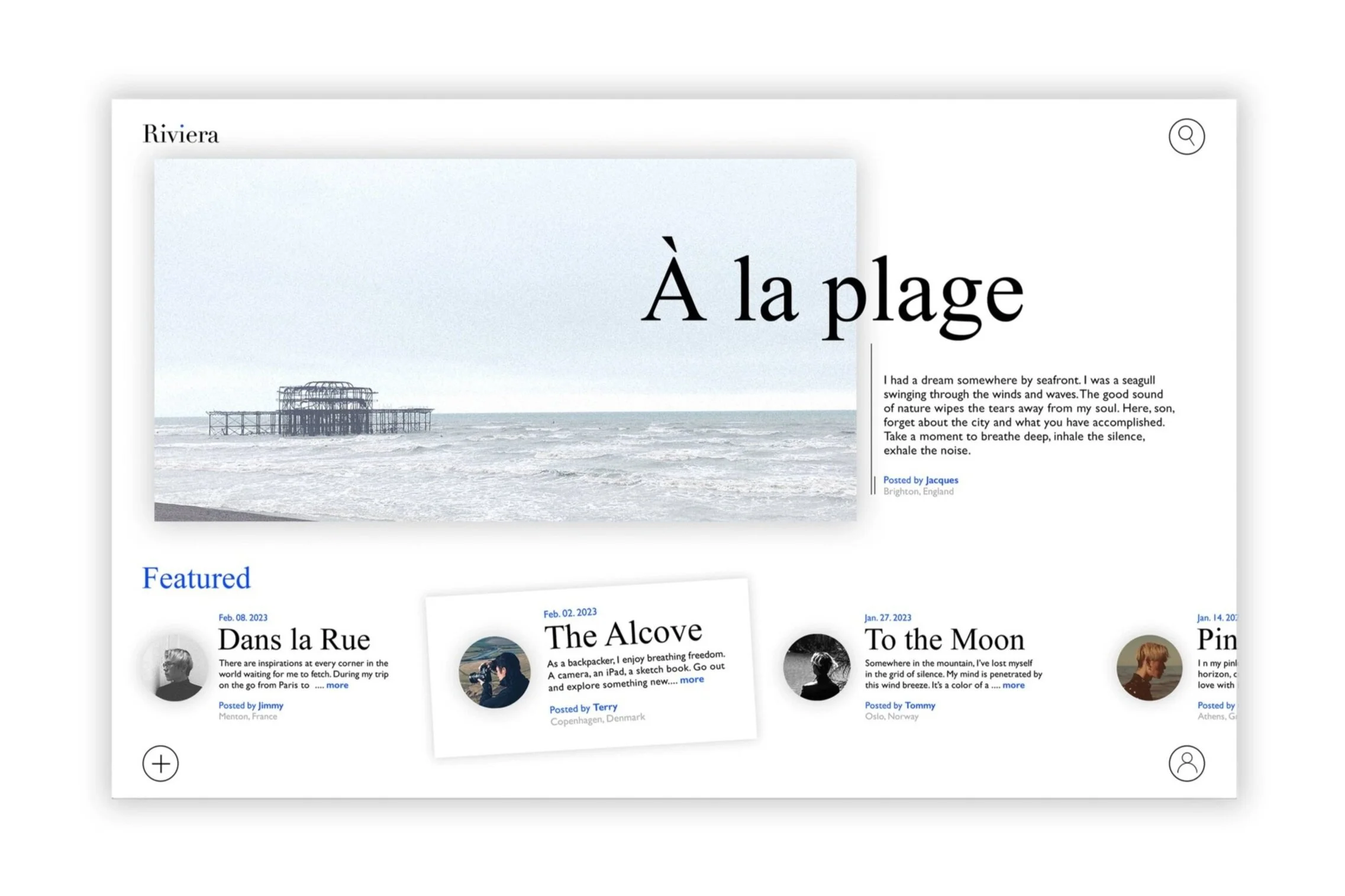Inspired by French Riviera / Inspiré de la Côte d'Azur, Riviera is a visual storytelling platform concept designed for photography lovers to share their life and travel experiences, blogs, and stories through photographs and videos taken along their journeys.